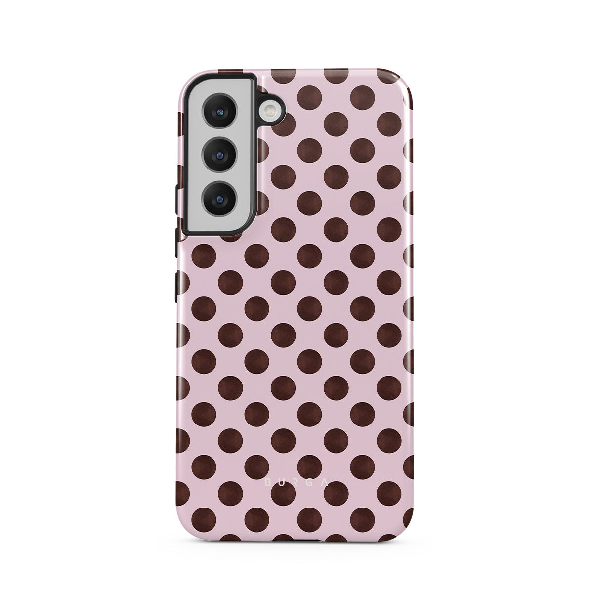 Este design contém: um padrão de bolinhas retrô, fundo rosa com bolinhas marrons.