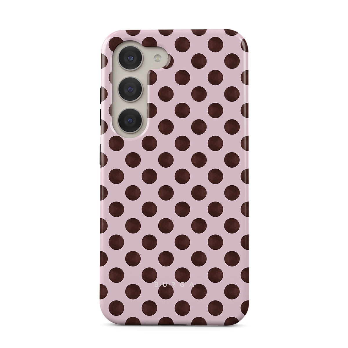 Este design contém: um padrão de bolinhas retrô, fundo rosa com bolinhas marrons.