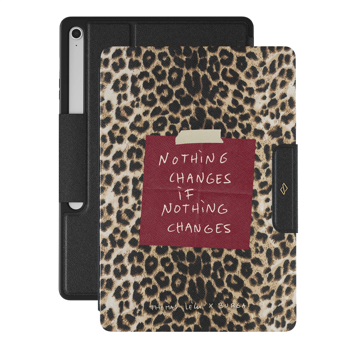 Este design contém: texto manuscrito, citação, post-it vermelho, estampa animal