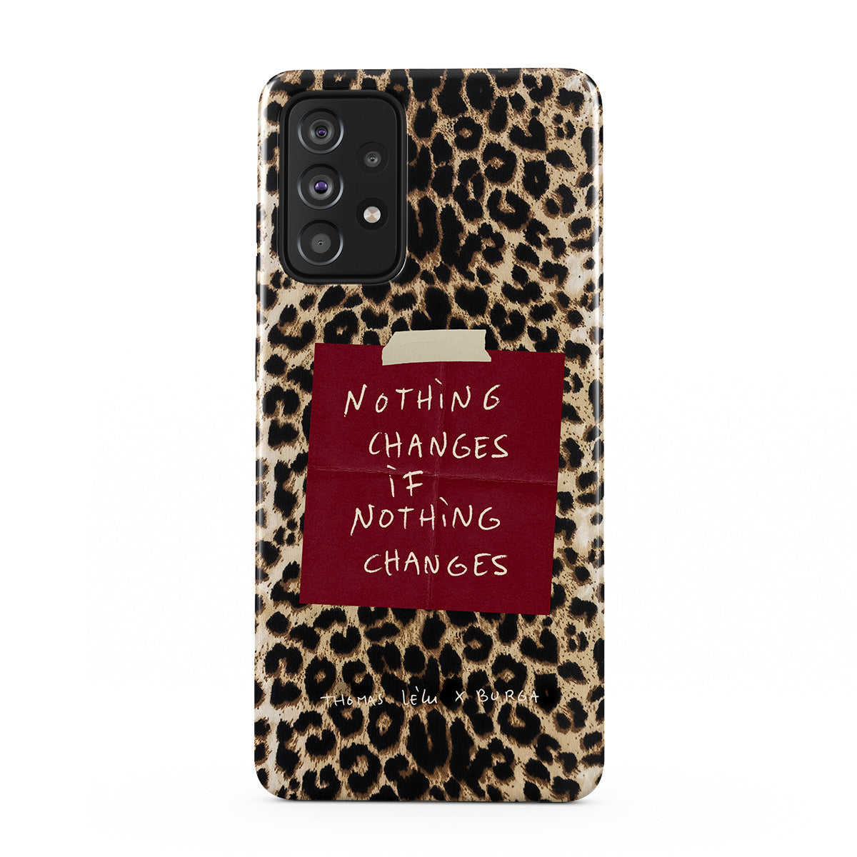 Este design contém: texto manuscrito, citação, post-it vermelho, estampa animal