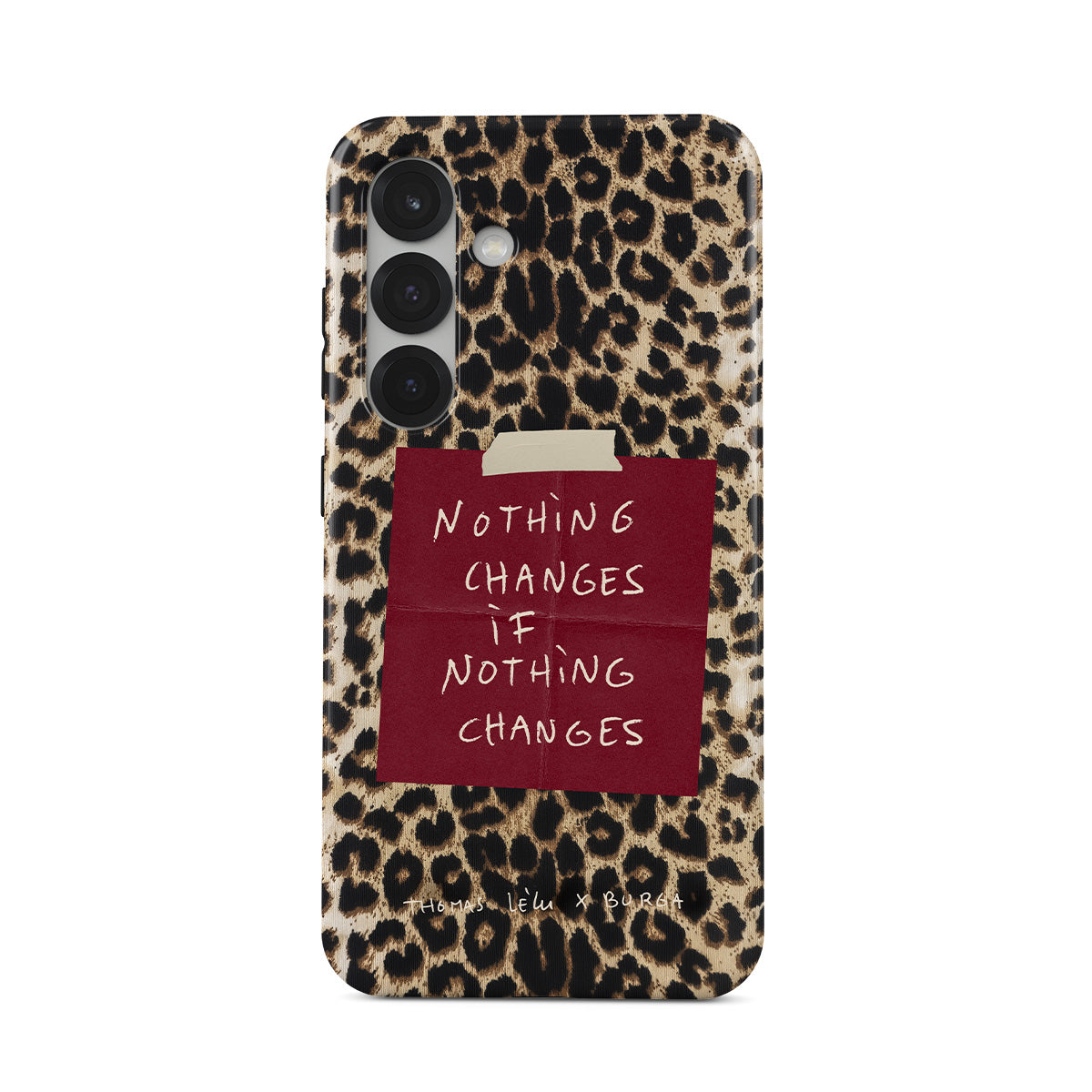 Este design contém: texto manuscrito, citação, post-it vermelho, estampa animal
