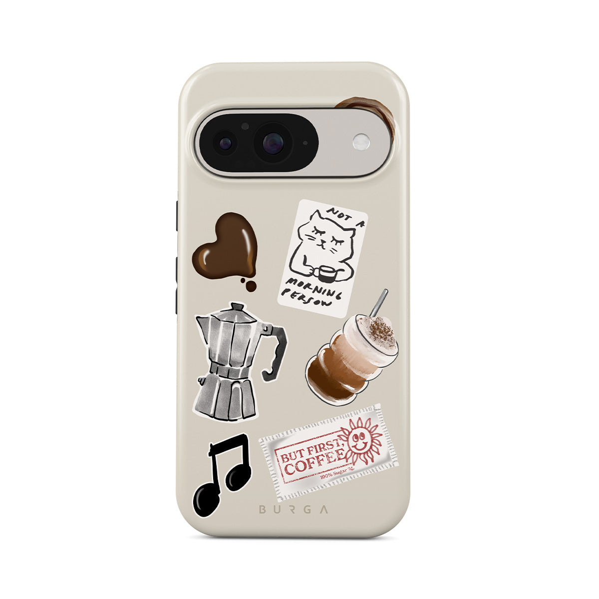 Este design contém: cafeteira moka, frappé, rolo de canela, coração de chocolate, adesivo "Não sou uma pessoa matinal", recibo "Mas primeiro, café", nota musical.