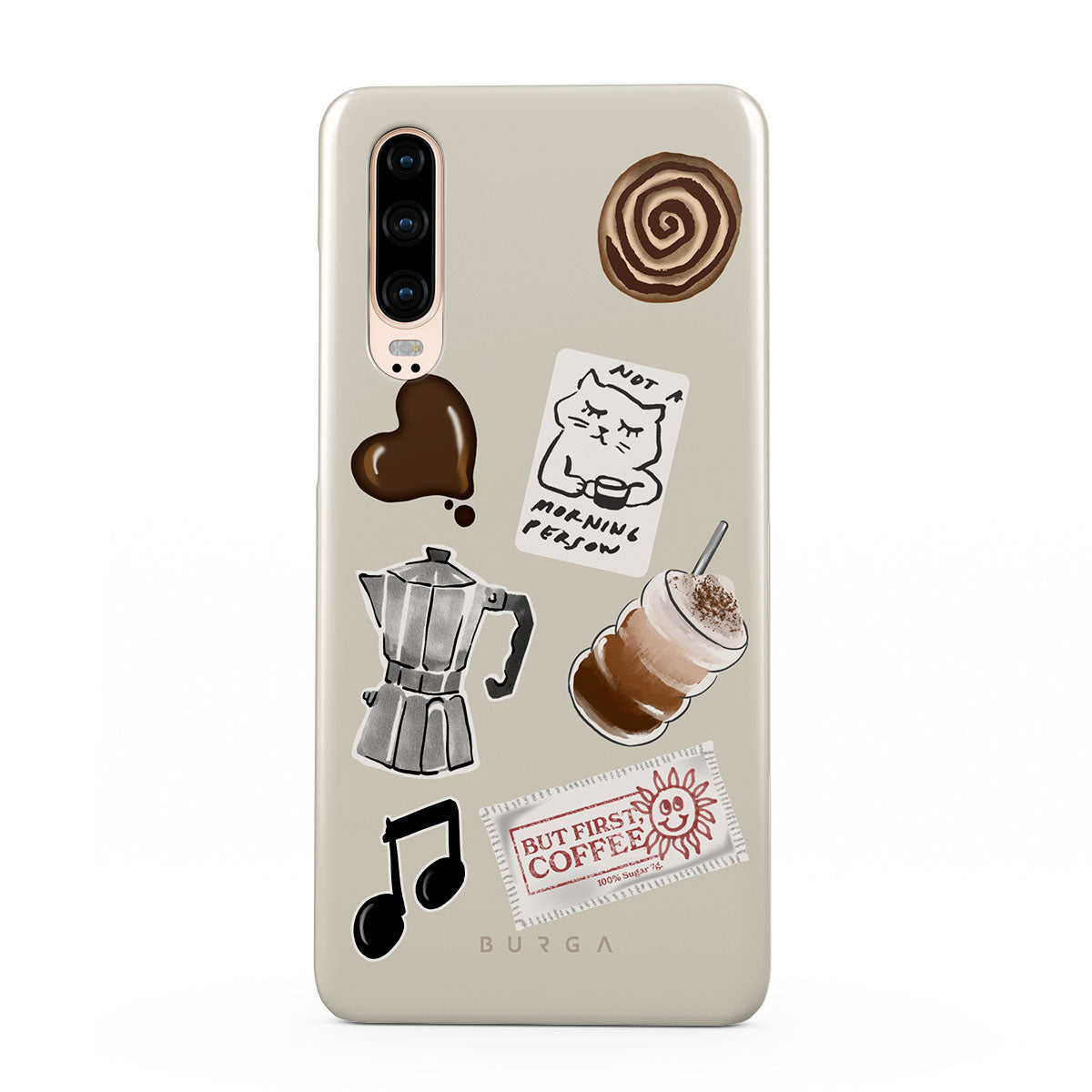 Este design contém: cafeteira moka, frappé, rolo de canela, coração de chocolate, adesivo "Não sou uma pessoa matinal", recibo "Mas primeiro, café", nota musical.