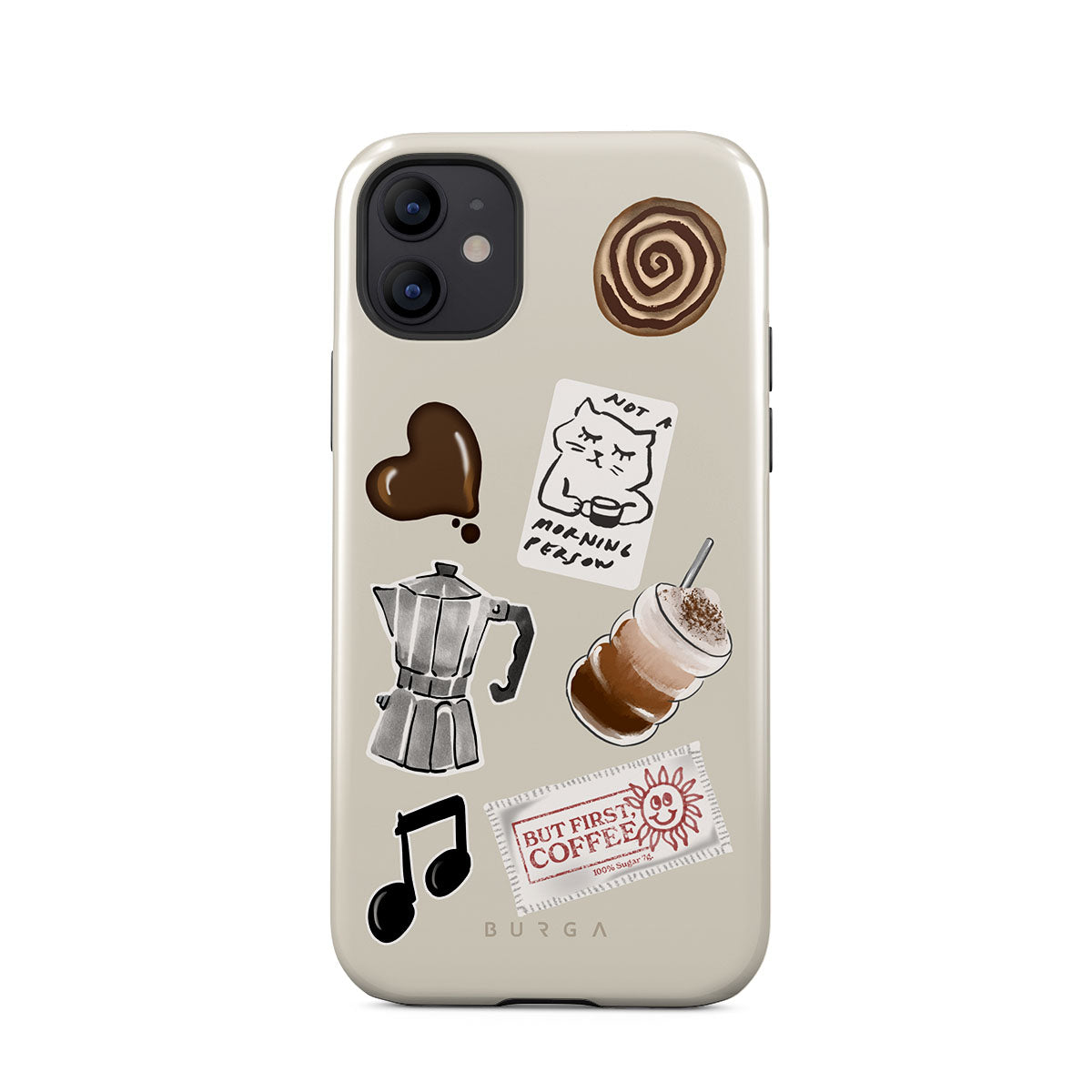 Este design contém: cafeteira moka, frappé, rolo de canela, coração de chocolate, adesivo "Não sou uma pessoa matinal", recibo "Mas primeiro, café", nota musical.