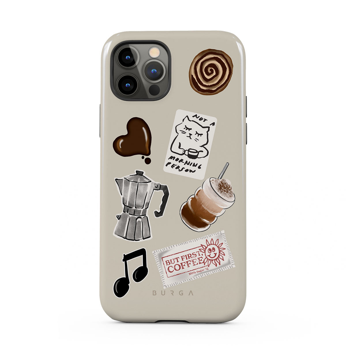 Este design contém: cafeteira moka, frappé, rolo de canela, coração de chocolate, adesivo "Não sou uma pessoa matinal", recibo "Mas primeiro, café", nota musical.
