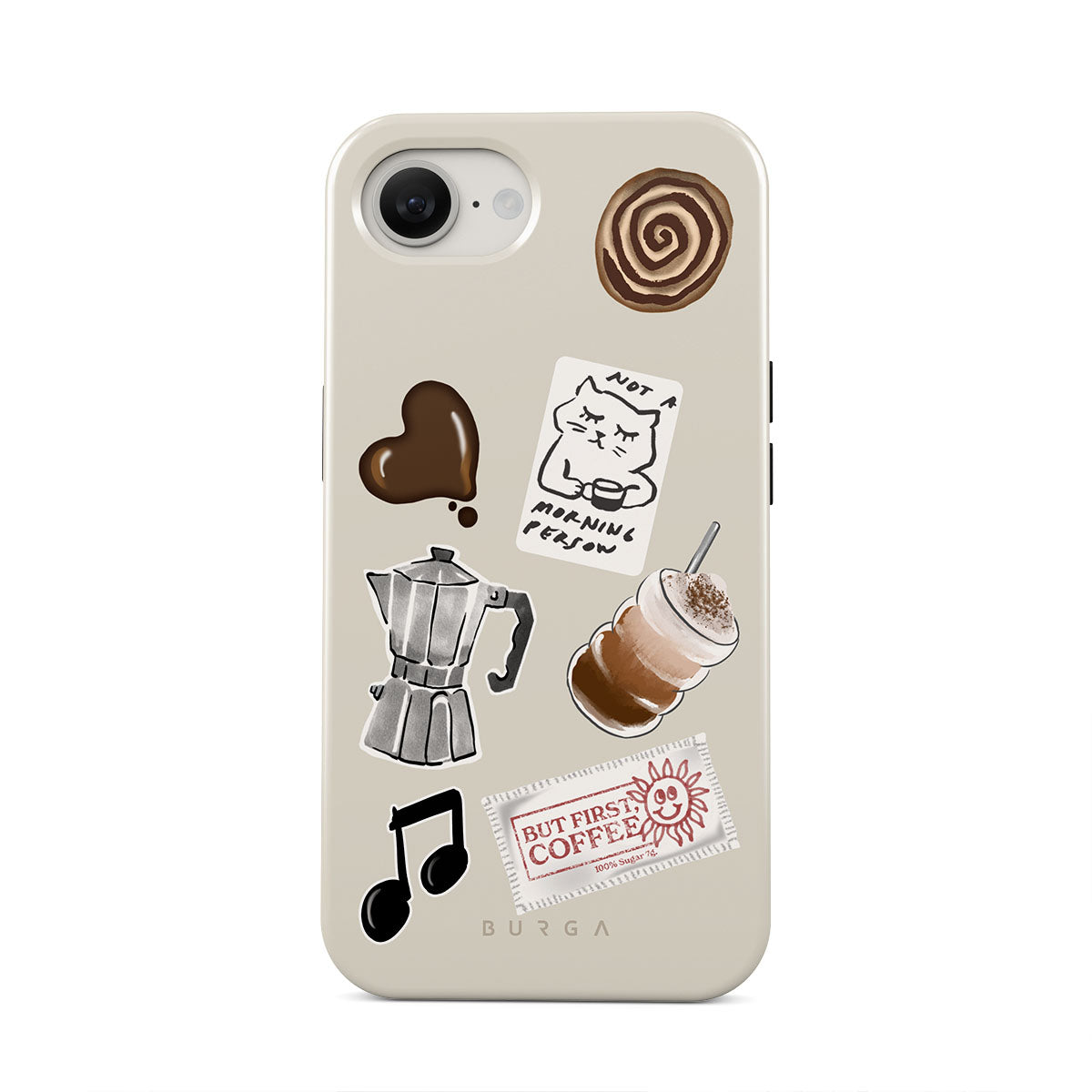 Este design contém: cafeteira moka, frappé, rolo de canela, coração de chocolate, adesivo "Não sou uma pessoa matinal", recibo "Mas primeiro, café", nota musical.