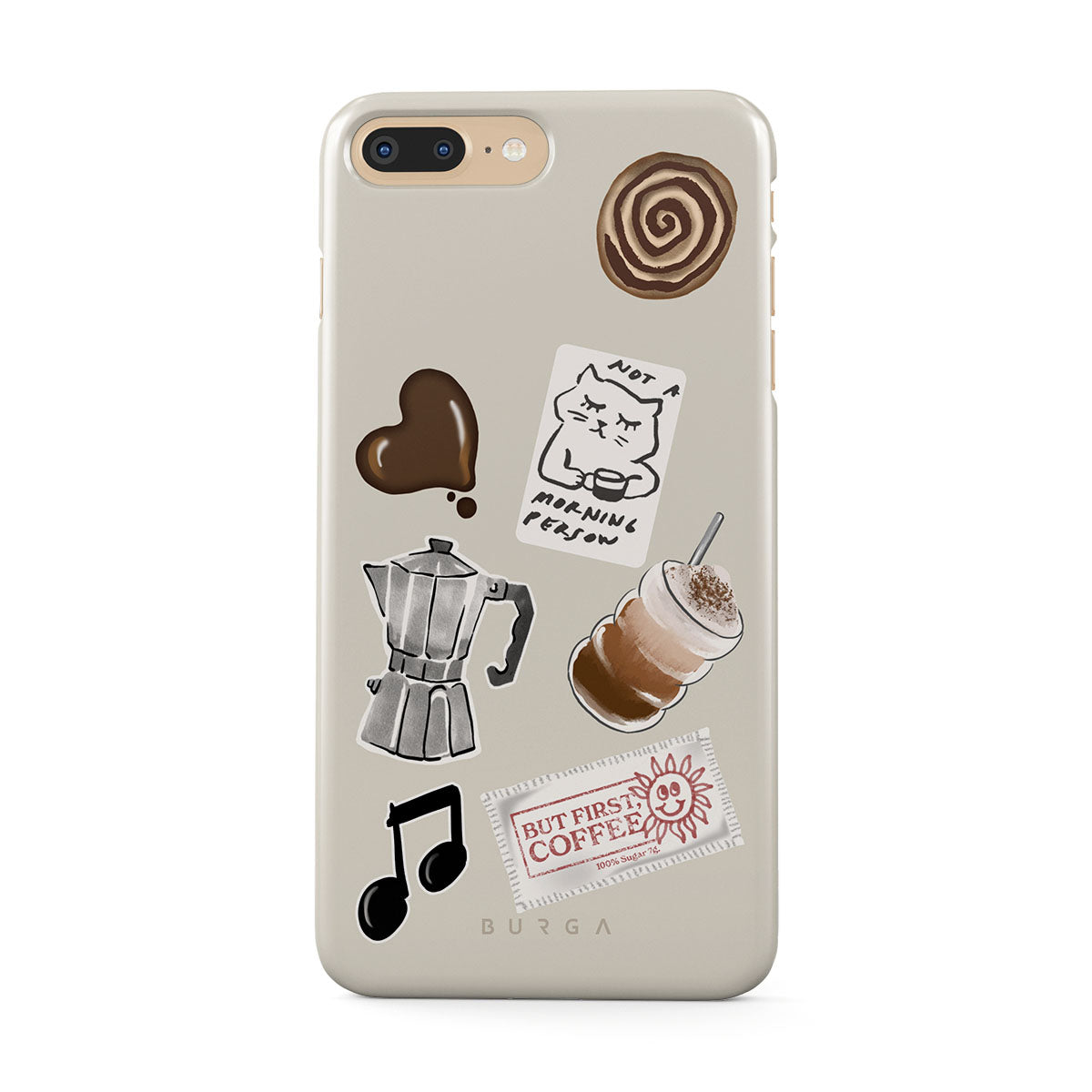 Este design contém: cafeteira moka, frappé, rolo de canela, coração de chocolate, adesivo "Não sou uma pessoa matinal", recibo "Mas primeiro, café", nota musical.