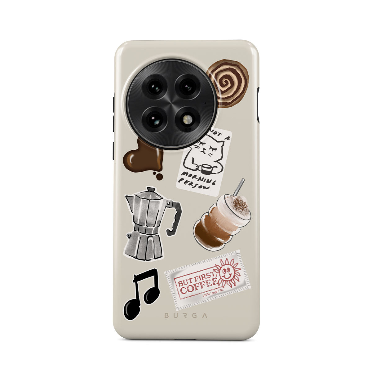 Este design contém: cafeteira moka, frappé, rolo de canela, coração de chocolate, adesivo "Não sou uma pessoa matinal", recibo "Mas primeiro, café", nota musical.