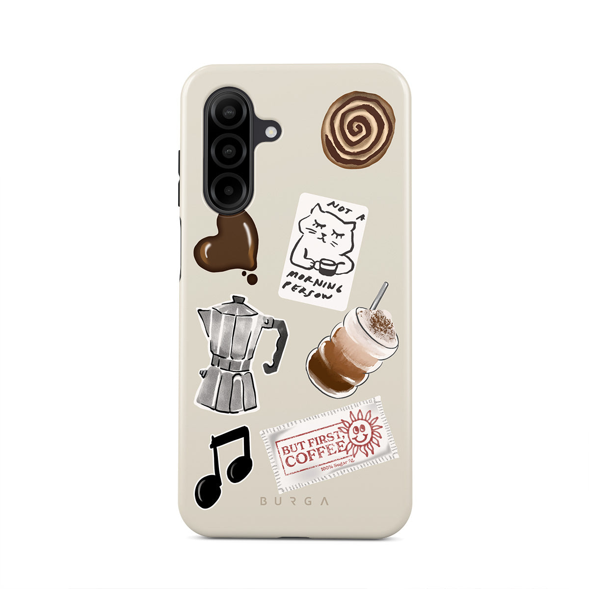 Este design contém: cafeteira moka, frappé, rolo de canela, coração de chocolate, adesivo "Não sou uma pessoa matinal", recibo "Mas primeiro, café", nota musical.