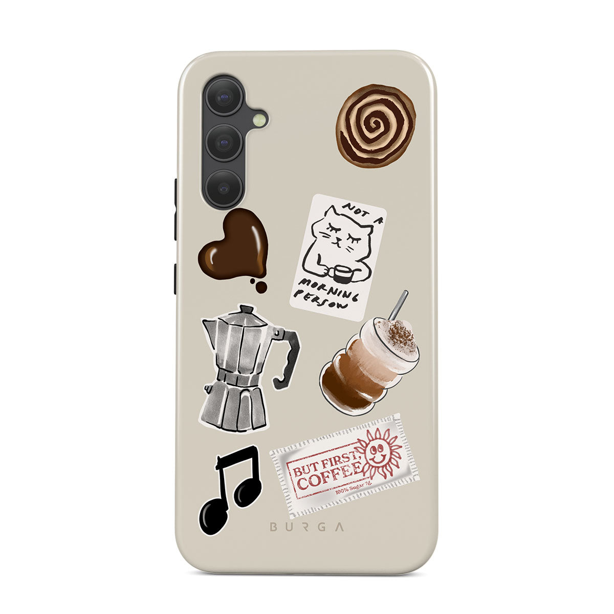 Este design contém: cafeteira moka, frappé, rolo de canela, coração de chocolate, adesivo "Não sou uma pessoa matinal", recibo "Mas primeiro, café", nota musical.