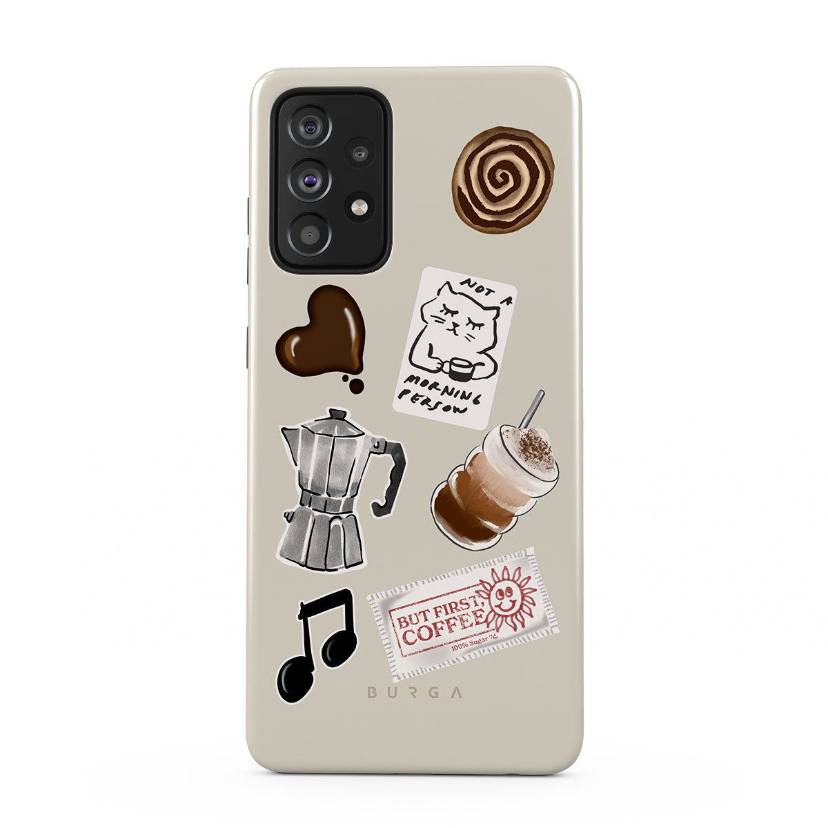 Este design contém: cafeteira moka, frappé, rolo de canela, coração de chocolate, adesivo "Não sou uma pessoa matinal", recibo "Mas primeiro, café", nota musical.