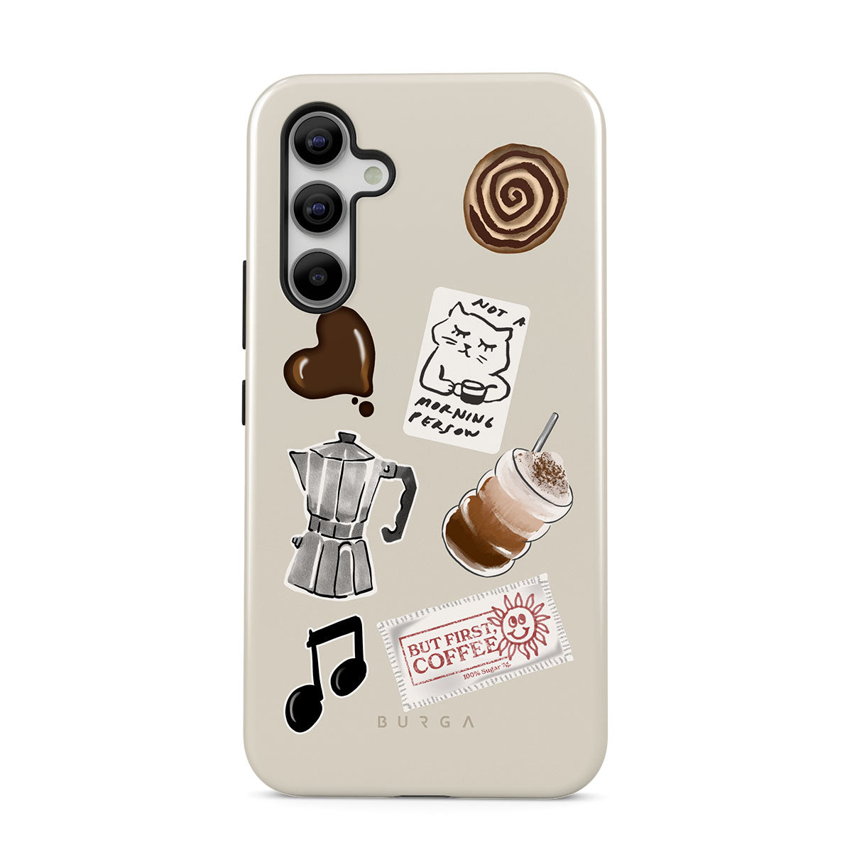 Este design contém: cafeteira moka, frappé, rolo de canela, coração de chocolate, adesivo "Não sou uma pessoa matinal", recibo "Mas primeiro, café", nota musical.
