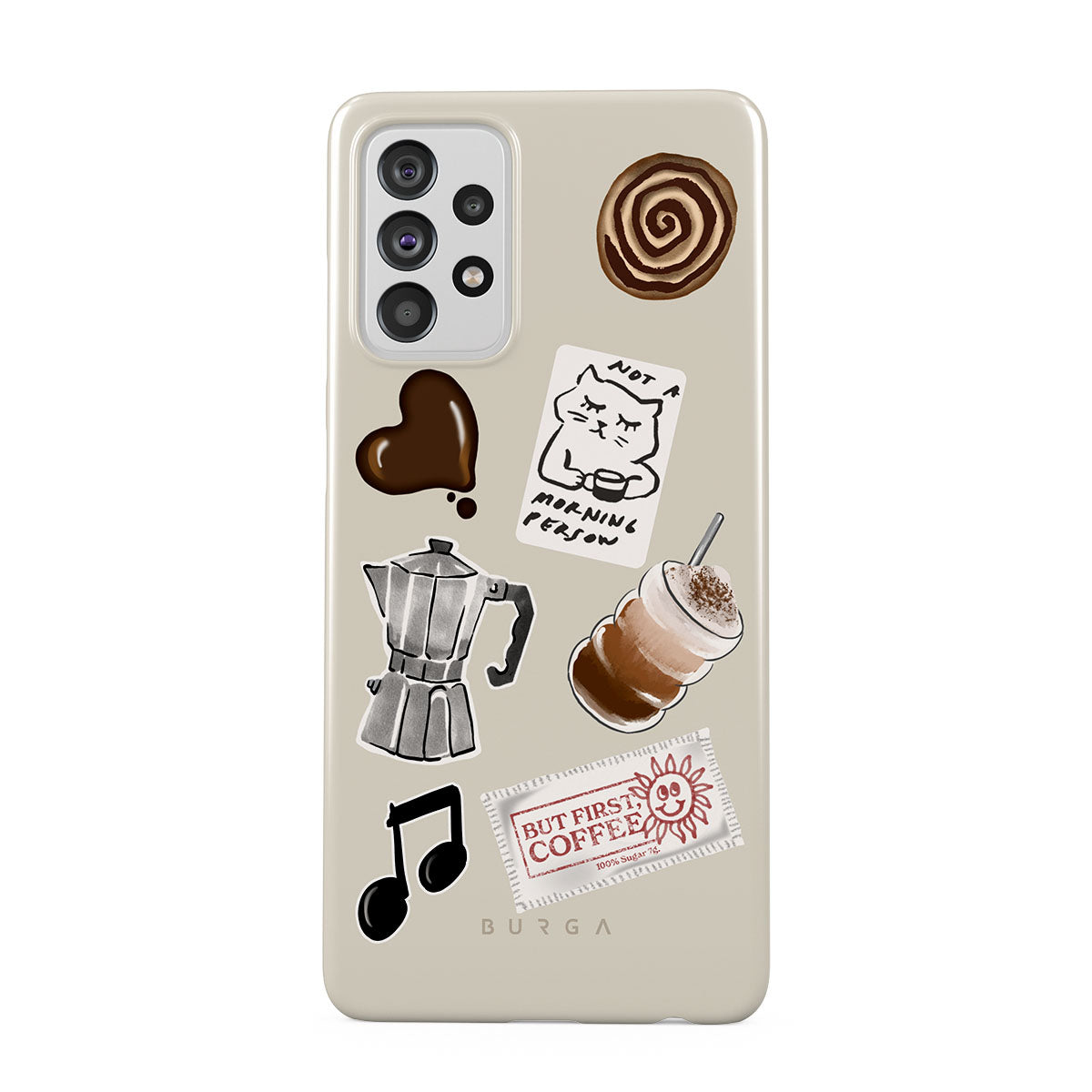 Este design contém: cafeteira moka, frappé, rolo de canela, coração de chocolate, adesivo "Não sou uma pessoa matinal", recibo "Mas primeiro, café", nota musical.