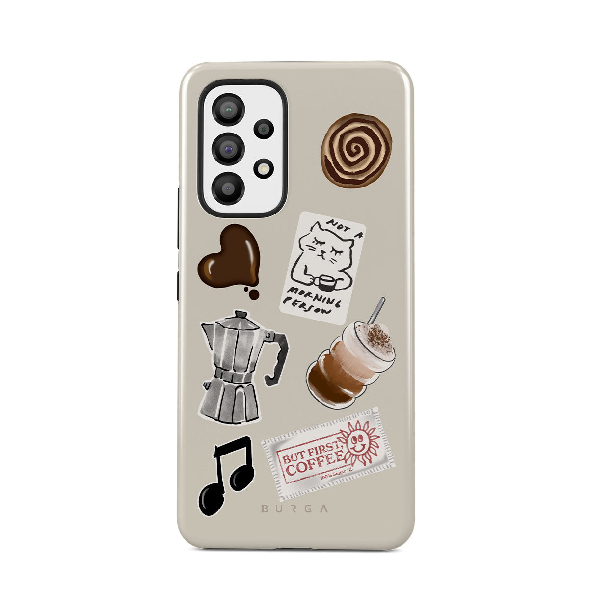 Este design contém: cafeteira moka, frappé, rolo de canela, coração de chocolate, adesivo "Não sou uma pessoa matinal", recibo "Mas primeiro, café", nota musical.