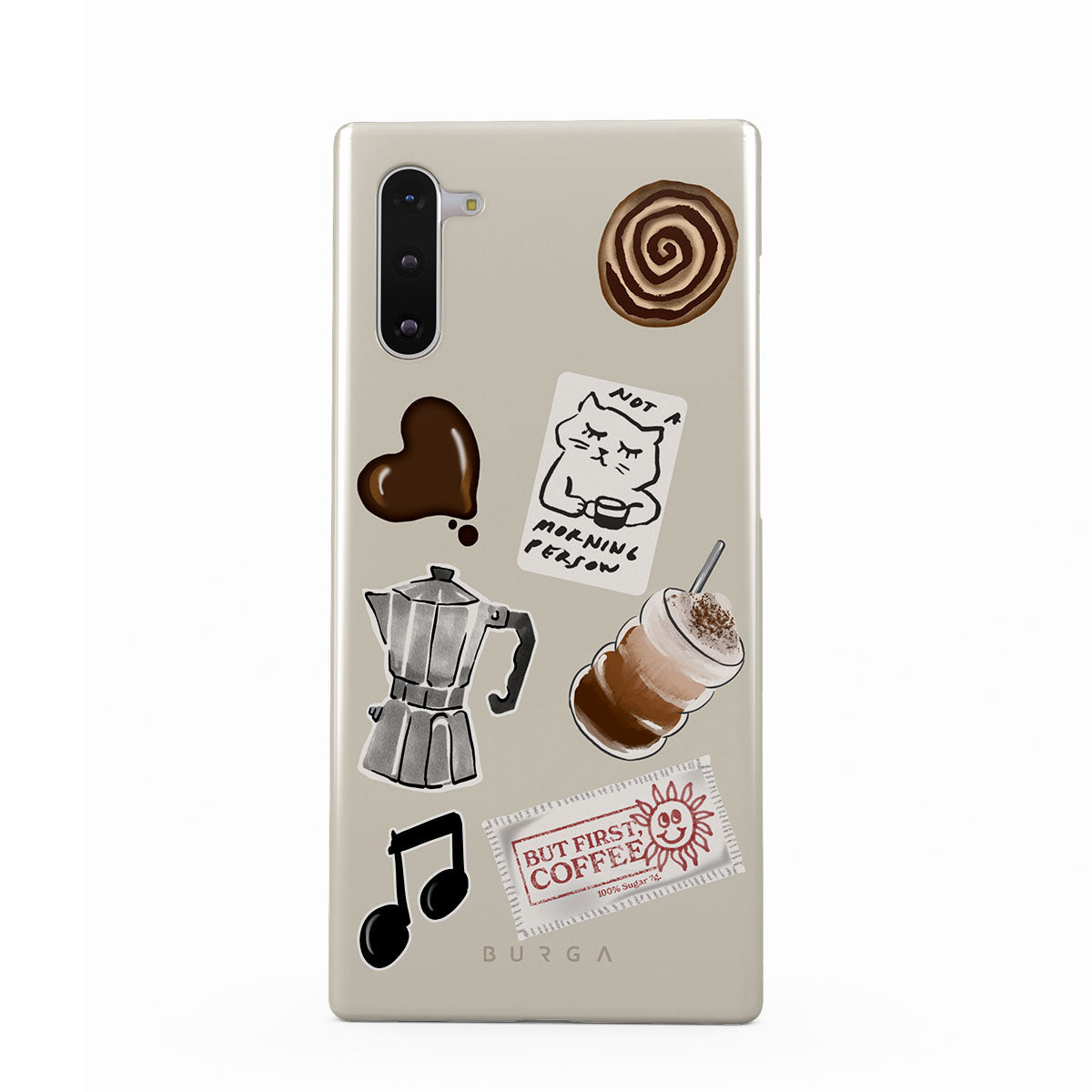 Este design contém: cafeteira moka, frappé, rolo de canela, coração de chocolate, adesivo "Não sou uma pessoa matinal", recibo "Mas primeiro, café", nota musical.