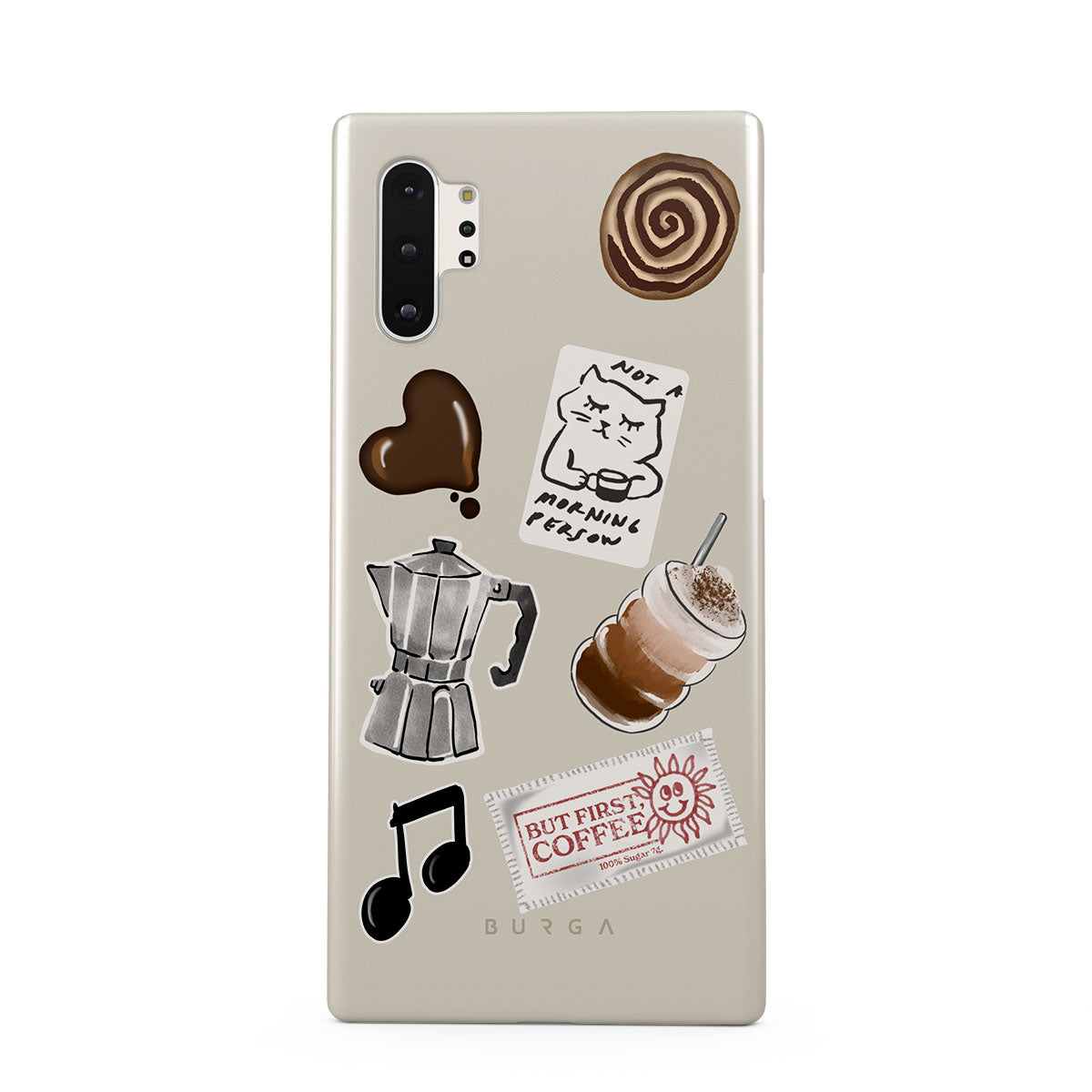 Este design contém: cafeteira moka, frappé, rolo de canela, coração de chocolate, adesivo "Não sou uma pessoa matinal", recibo "Mas primeiro, café", nota musical.