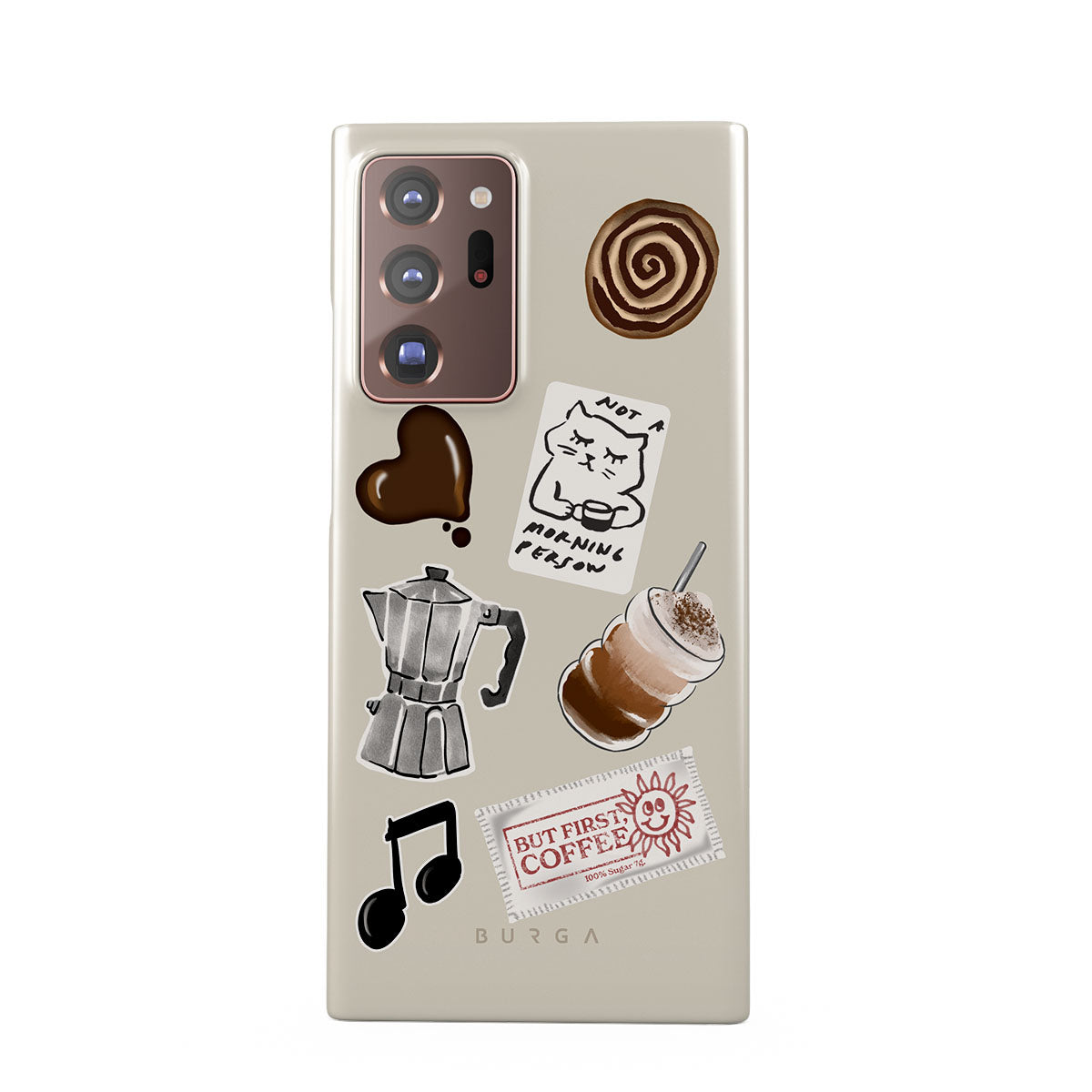 Este design contém: cafeteira moka, frappé, rolo de canela, coração de chocolate, adesivo "Não sou uma pessoa matinal", recibo "Mas primeiro, café", nota musical.