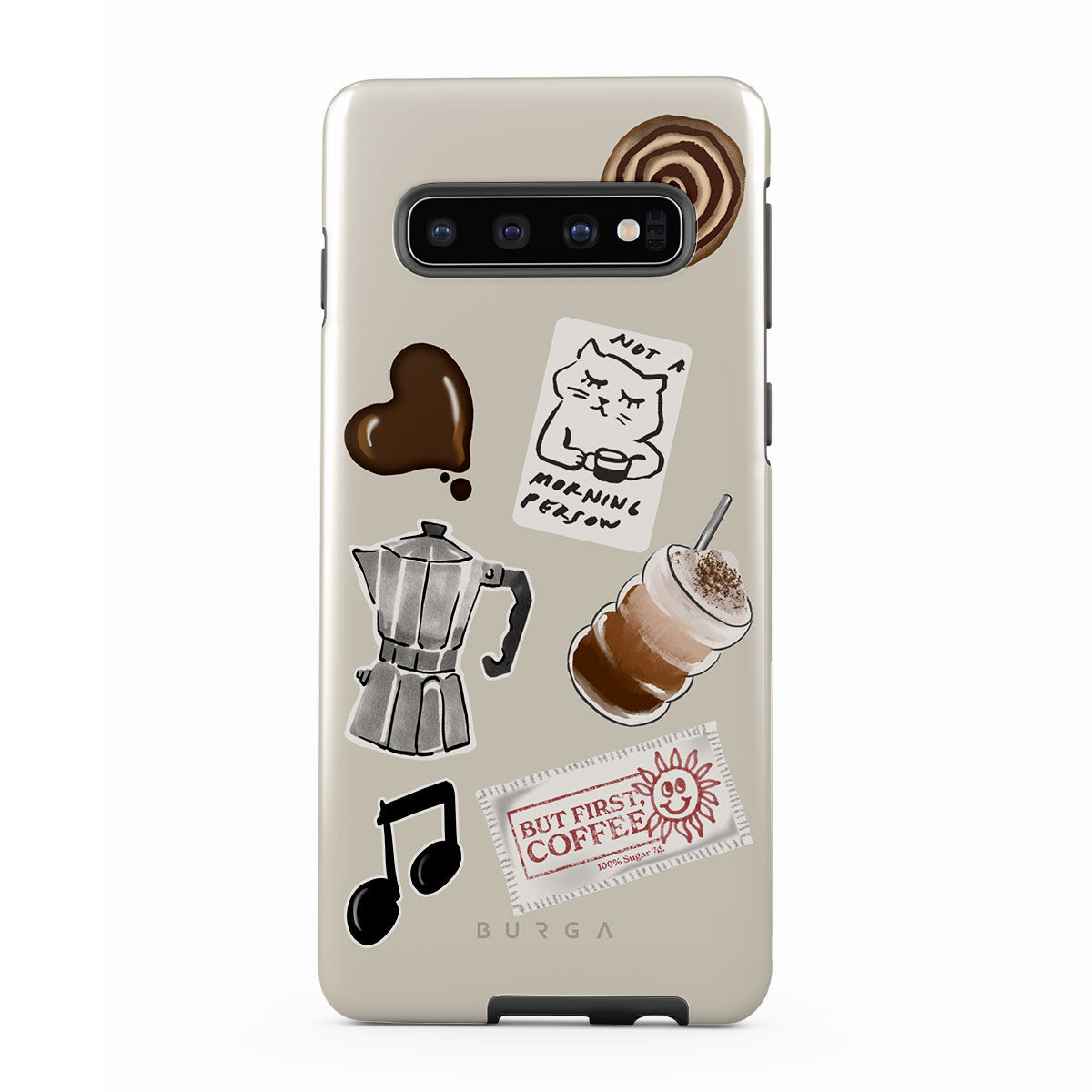Este design contém: cafeteira moka, frappé, rolo de canela, coração de chocolate, adesivo "Não sou uma pessoa matinal", recibo "Mas primeiro, café", nota musical.