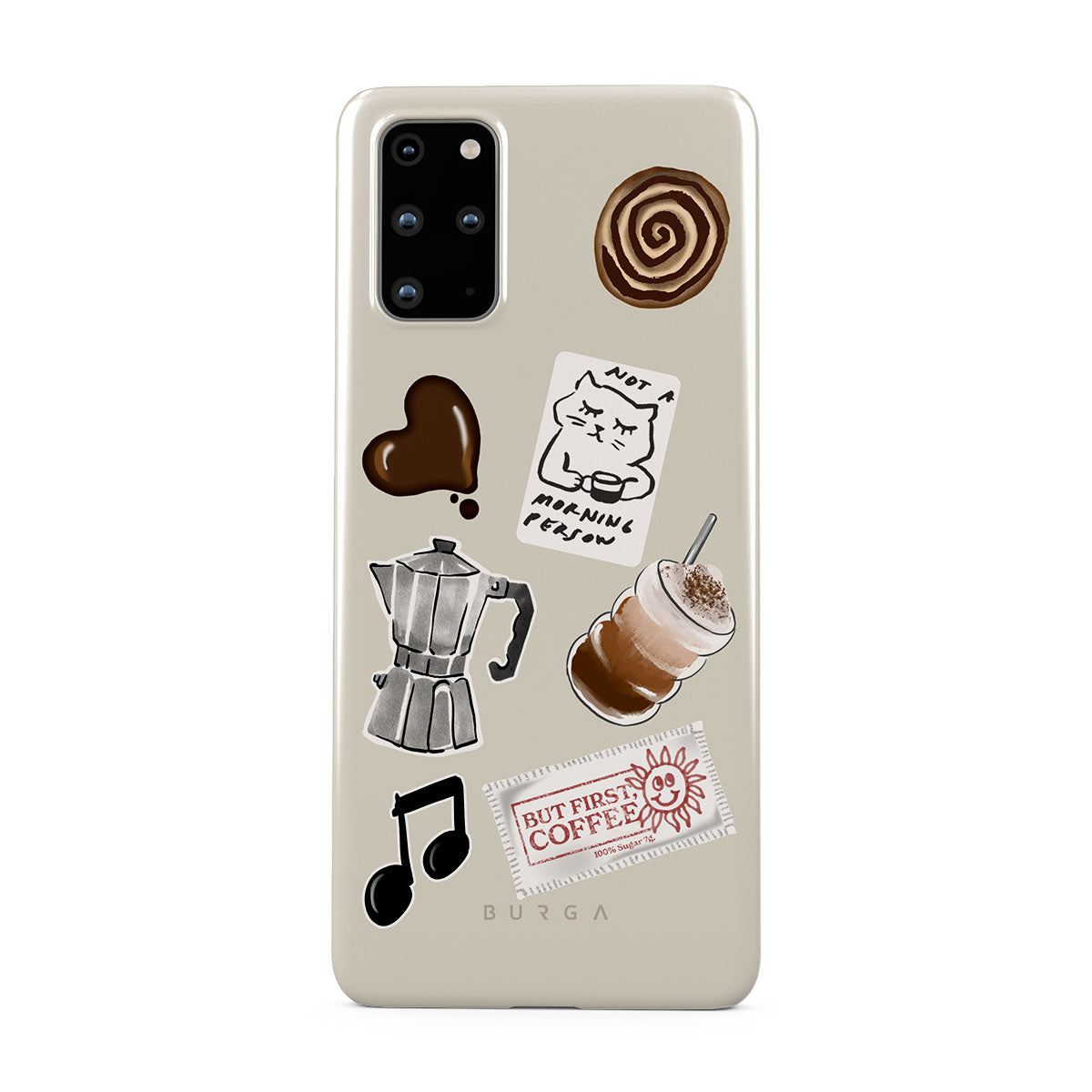 Este design contém: cafeteira moka, frappé, rolo de canela, coração de chocolate, adesivo "Não sou uma pessoa matinal", recibo "Mas primeiro, café", nota musical.
