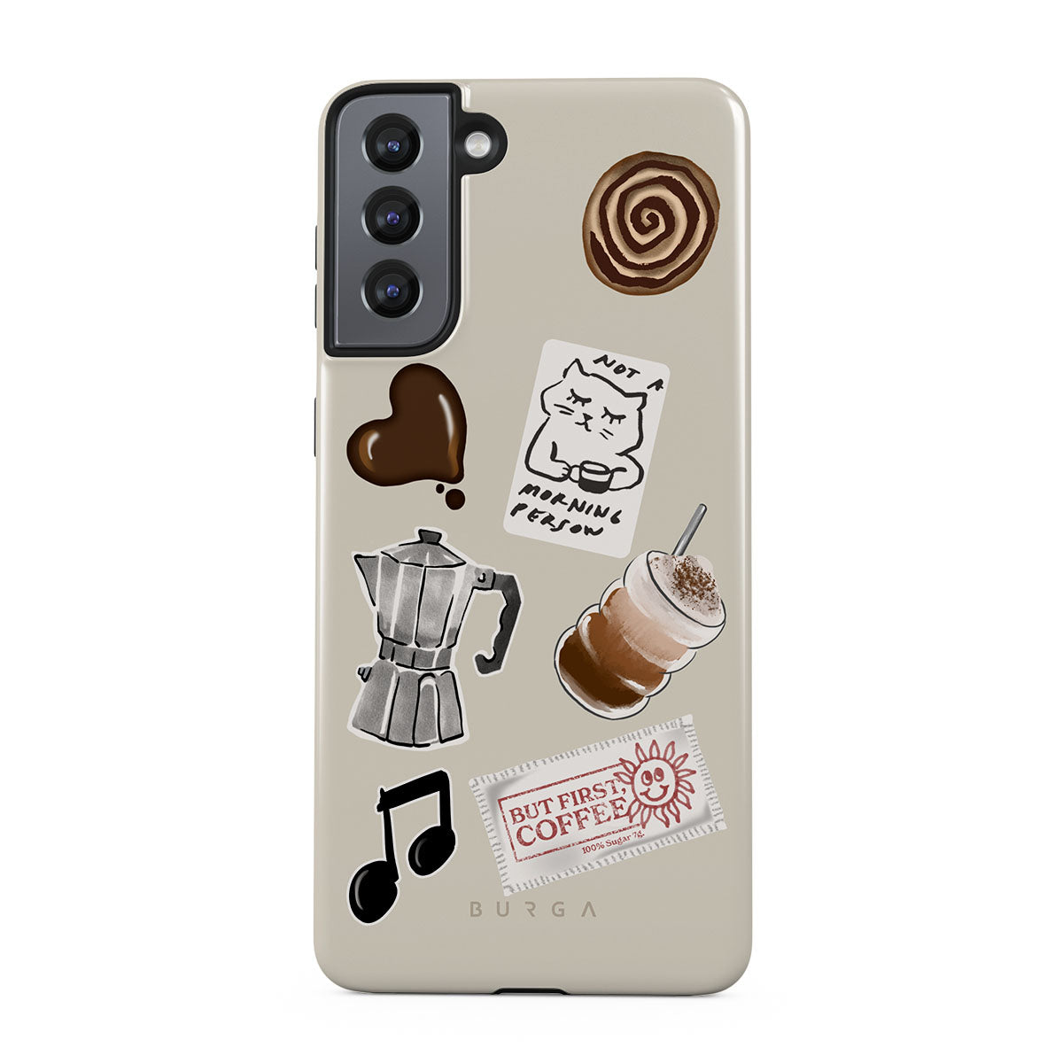 Este design contém: cafeteira moka, frappé, rolo de canela, coração de chocolate, adesivo "Não sou uma pessoa matinal", recibo "Mas primeiro, café", nota musical.