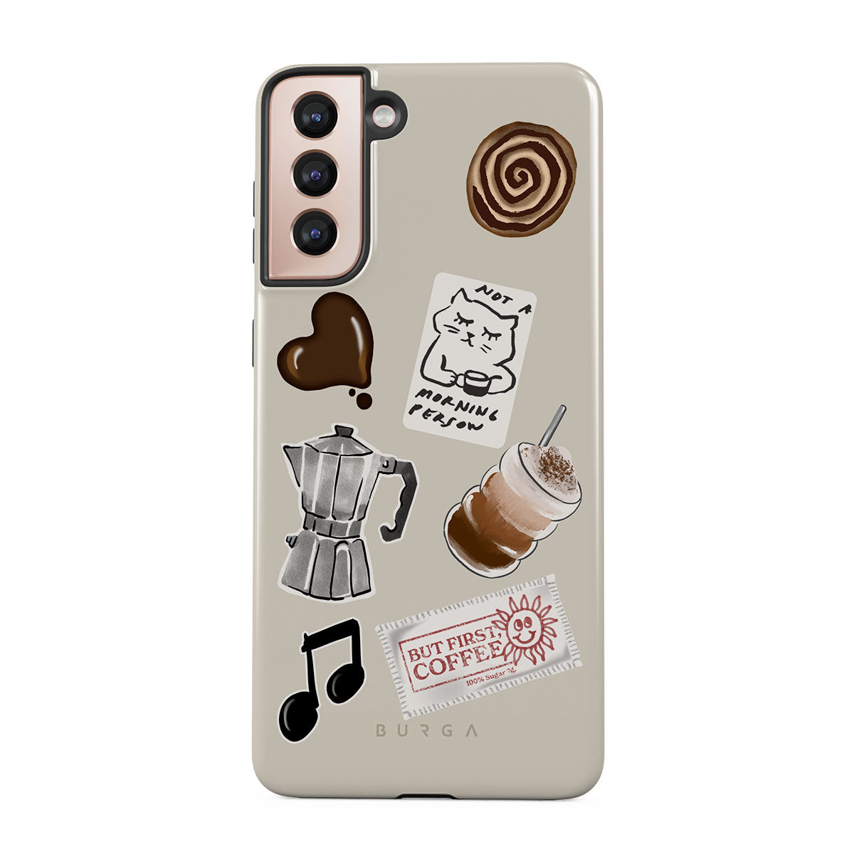 Este design contém: cafeteira moka, frappé, rolo de canela, coração de chocolate, adesivo "Não sou uma pessoa matinal", recibo "Mas primeiro, café", nota musical.