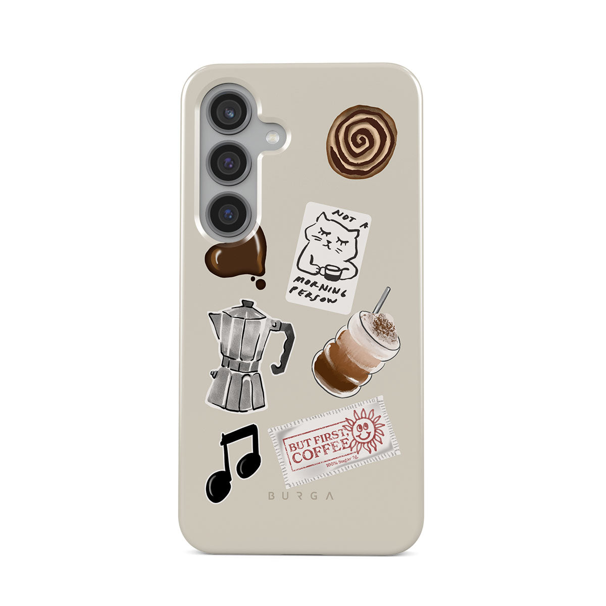 Este design contém: cafeteira moka, frappé, rolo de canela, coração de chocolate, adesivo "Não sou uma pessoa matinal", recibo "Mas primeiro, café", nota musical.