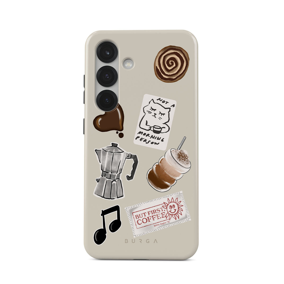 Este design contém: cafeteira moka, frappé, rolo de canela, coração de chocolate, adesivo "Não sou uma pessoa matinal", recibo "Mas primeiro, café", nota musical.