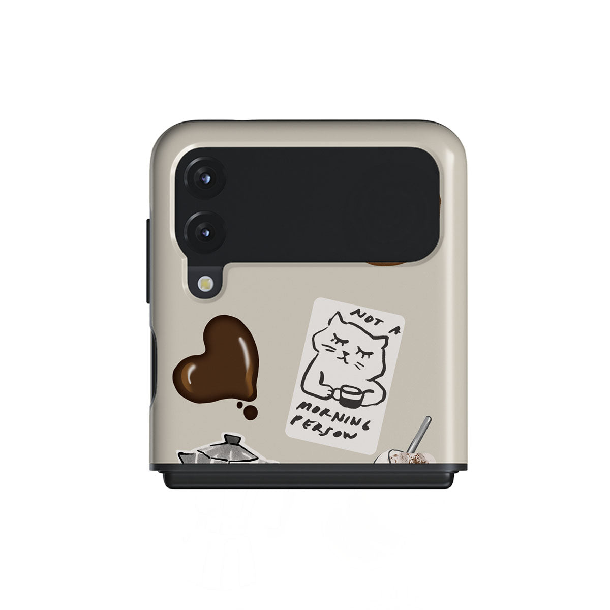 Este design contém: cafeteira moka, frappé, rolo de canela, coração de chocolate, adesivo "Não sou uma pessoa matinal", recibo "Mas primeiro, café", nota musical.