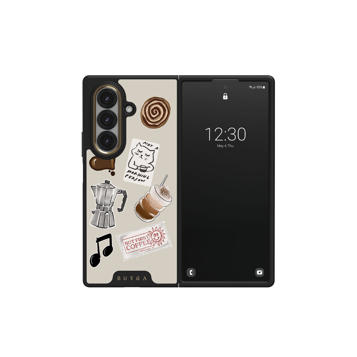Este design contém: cafeteira moka, frappé, rolo de canela, coração de chocolate, adesivo "Não sou uma pessoa matinal", recibo "Mas primeiro, café", nota musical.