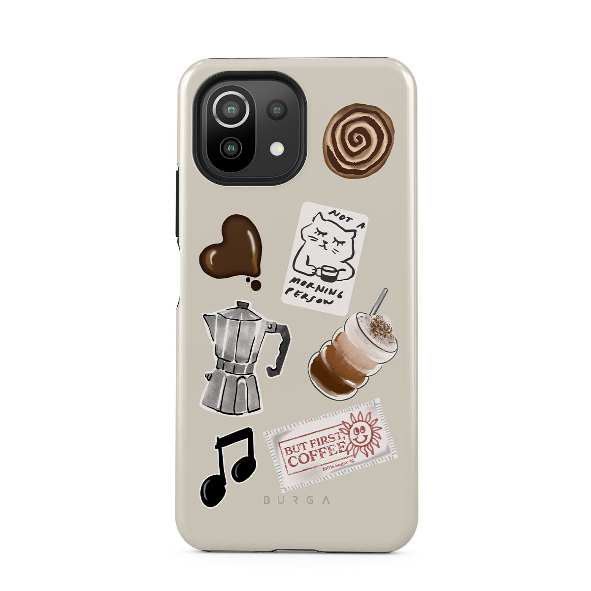 Este design contém: cafeteira moka, frappé, rolo de canela, coração de chocolate, adesivo "Não sou uma pessoa matinal", recibo "Mas primeiro, café", nota musical.