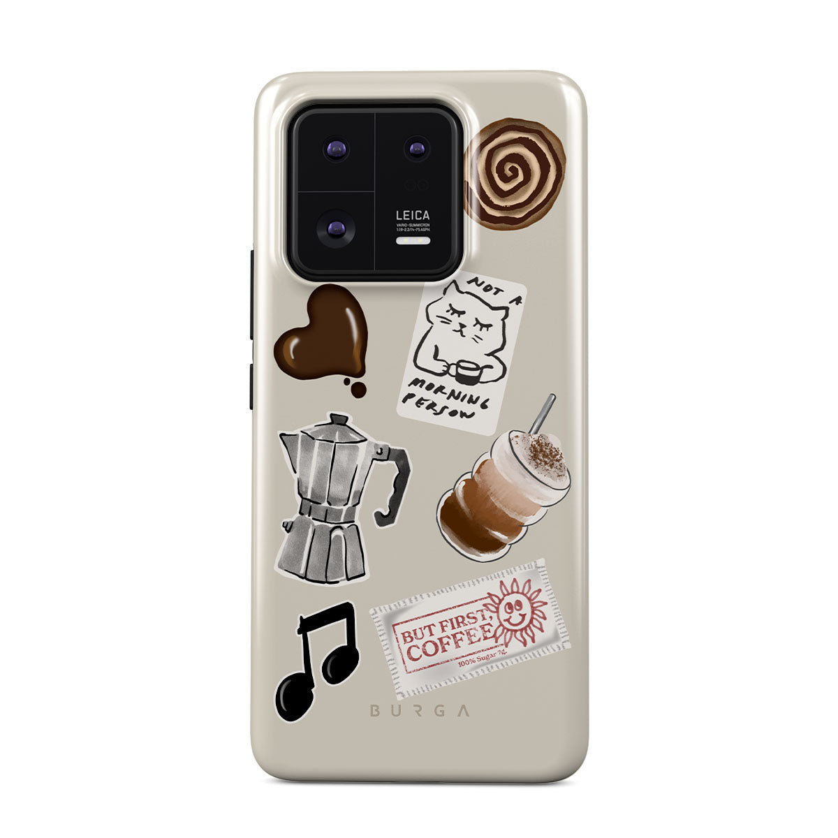 Este design contém: cafeteira moka, frappé, rolo de canela, coração de chocolate, adesivo "Não sou uma pessoa matinal", recibo "Mas primeiro, café", nota musical.