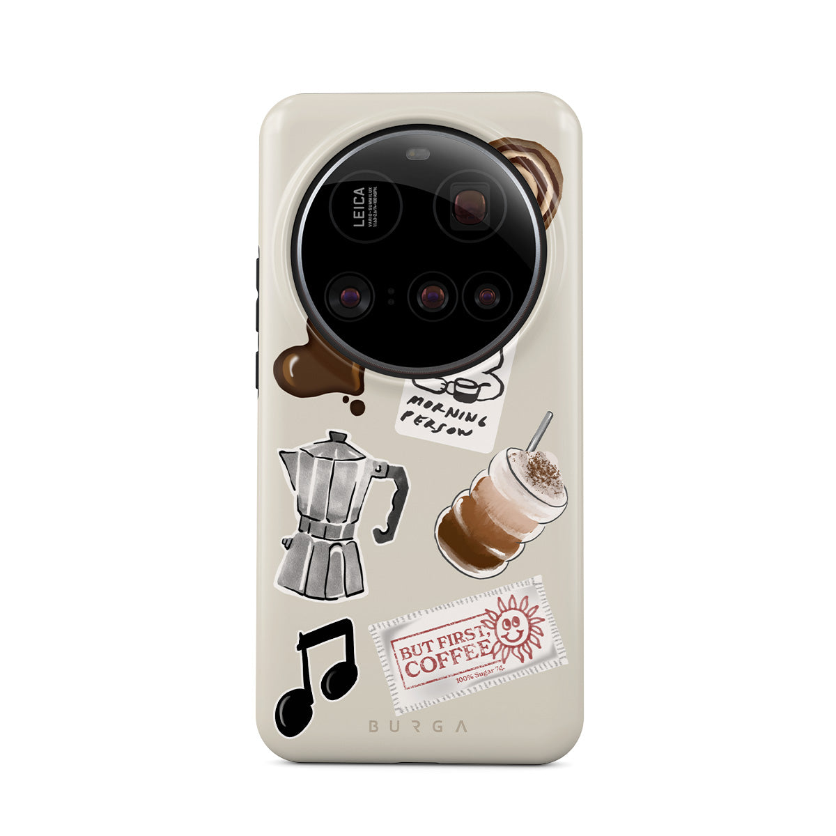Este design contém: cafeteira moka, frappé, rolo de canela, coração de chocolate, adesivo "Não sou uma pessoa matinal", recibo "Mas primeiro, café", nota musical.