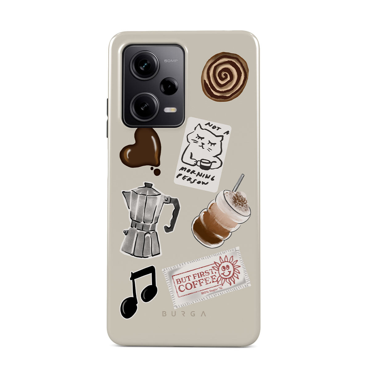 Este design contém: cafeteira moka, frappé, rolo de canela, coração de chocolate, adesivo "Não sou uma pessoa matinal", recibo "Mas primeiro, café", nota musical.