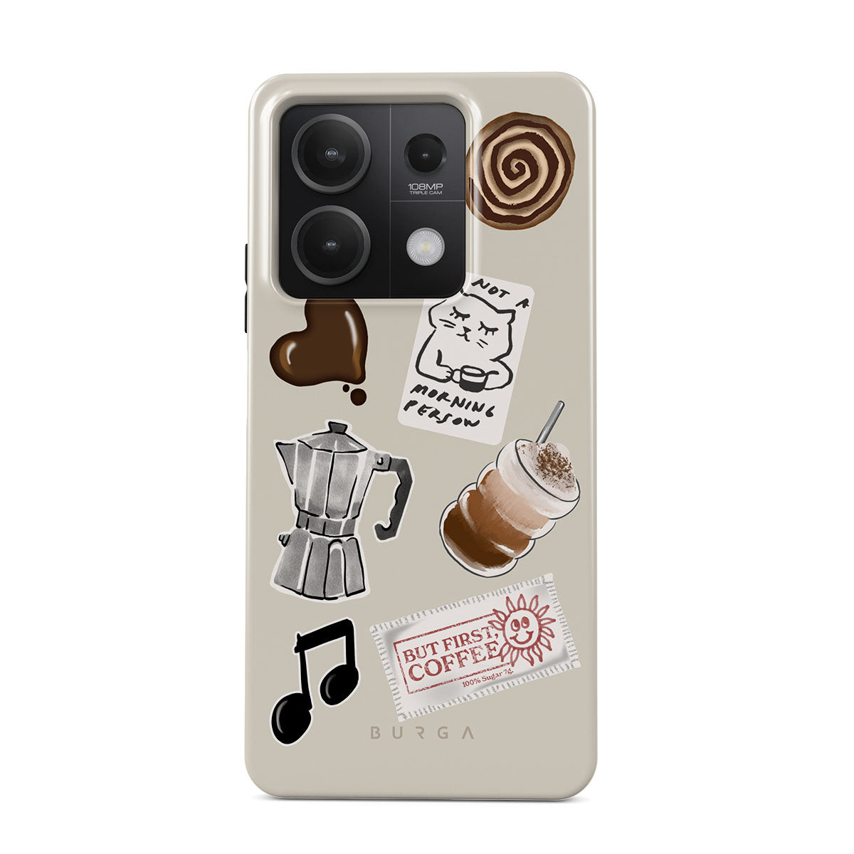 Este design contém: cafeteira moka, frappé, rolo de canela, coração de chocolate, adesivo "Não sou uma pessoa matinal", recibo "Mas primeiro, café", nota musical.