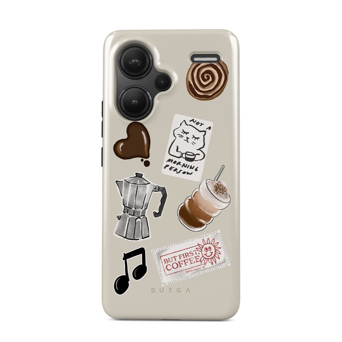 Este design contém: cafeteira moka, frappé, rolo de canela, coração de chocolate, adesivo "Não sou uma pessoa matinal", recibo "Mas primeiro, café", nota musical.