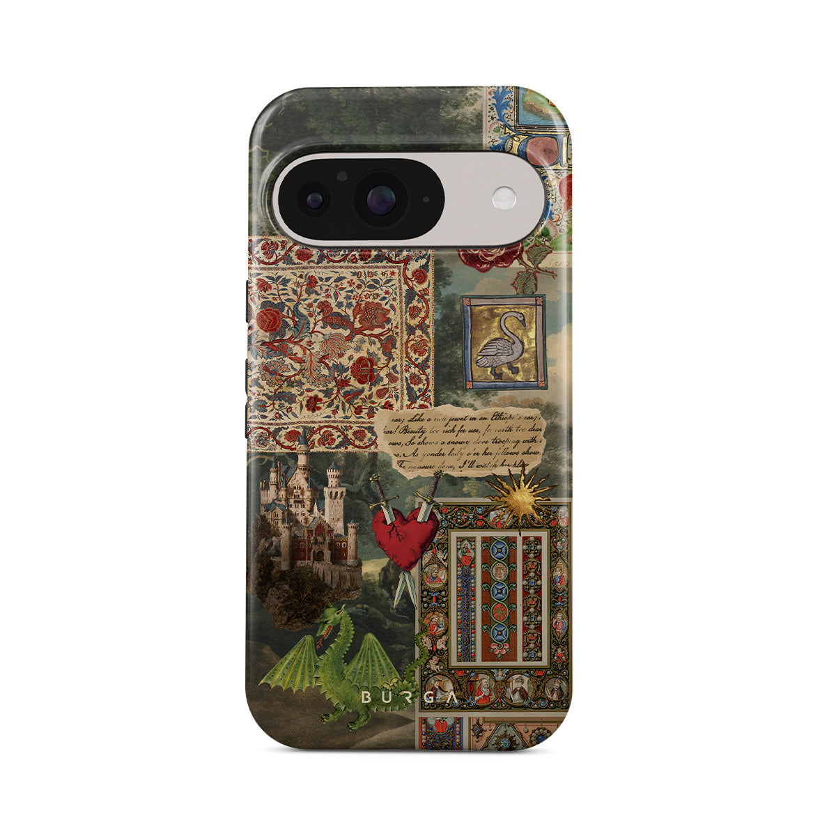 Este design contém: fonte de caligrafia manuscrita, impressão vintage, design medieval, padrão floral, ilustrações antigas, coração, dragão, castelo
