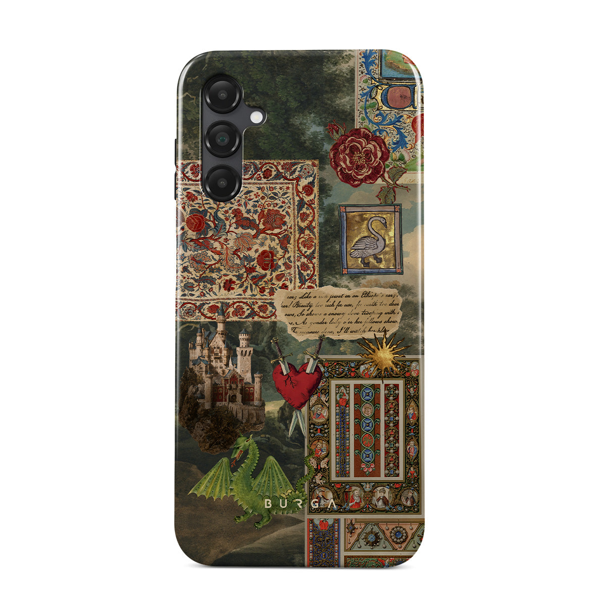 Este design contém: fonte de caligrafia manuscrita, impressão vintage, design medieval, padrão floral, ilustrações antigas, coração, dragão, castelo