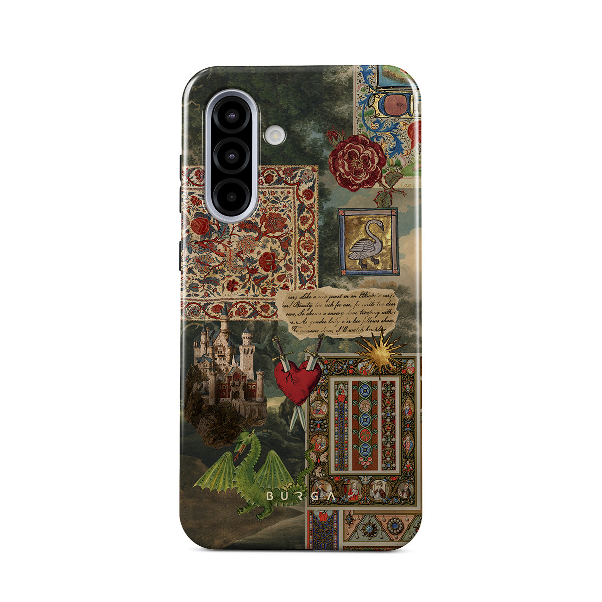 Este design contém: fonte de caligrafia manuscrita, impressão vintage, design medieval, padrão floral, ilustrações antigas, coração, dragão, castelo