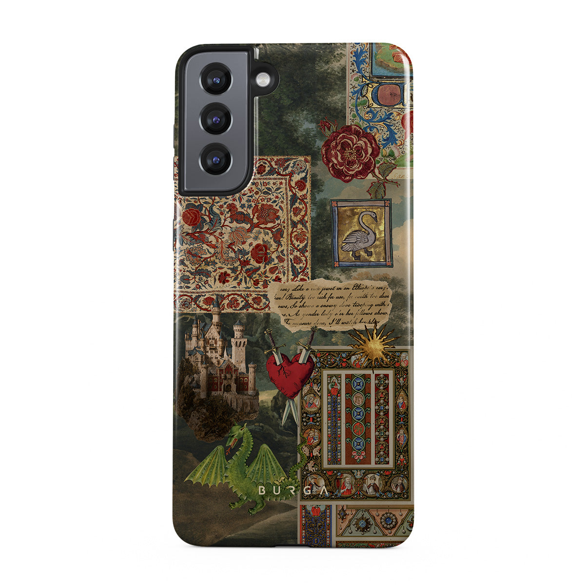 Este design contém: fonte de caligrafia manuscrita, impressão vintage, design medieval, padrão floral, ilustrações antigas, coração, dragão, castelo
