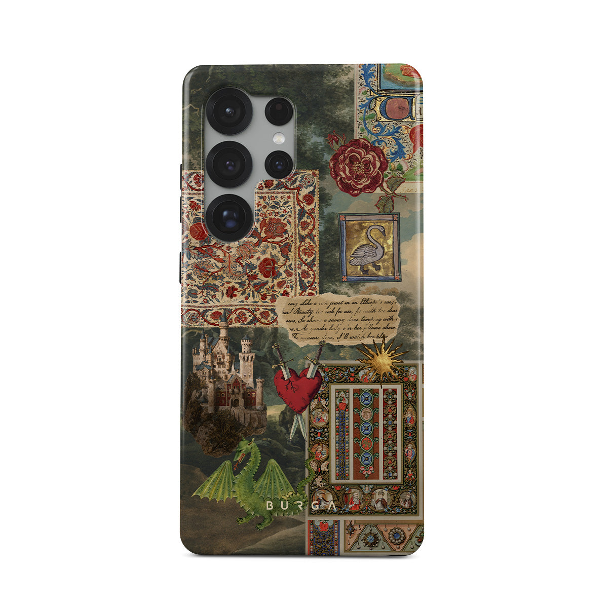 Este design contém: fonte de caligrafia manuscrita, impressão vintage, design medieval, padrão floral, ilustrações antigas, coração, dragão, castelo