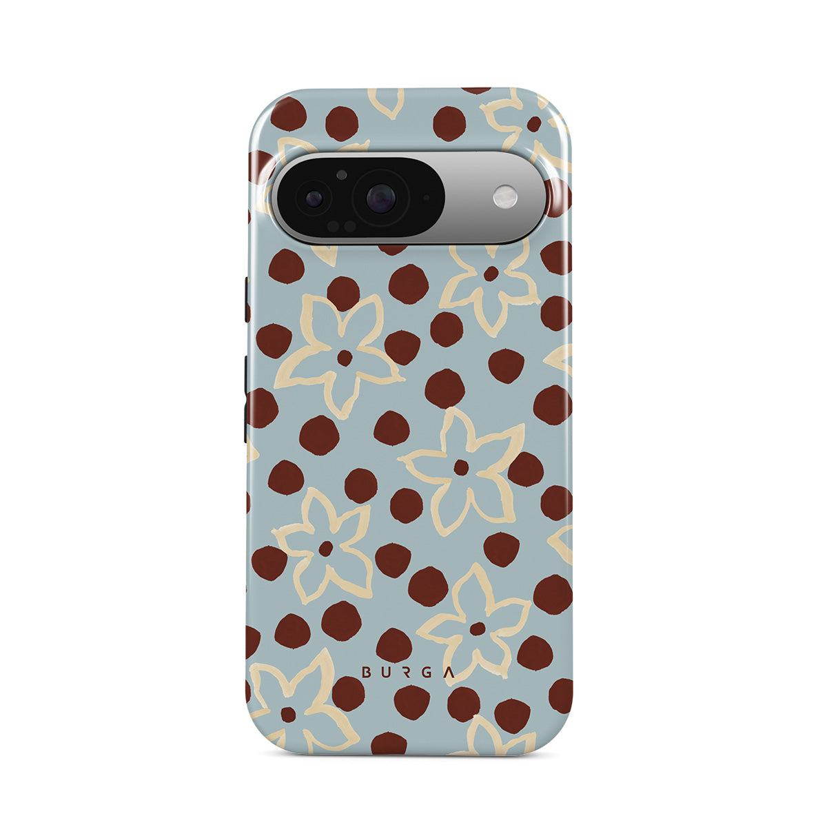 Este design contém: flores, padrão de bolinhas, fundo azul claro