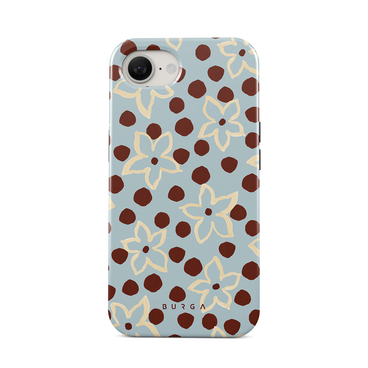 Este design contém: flores, padrão de bolinhas, fundo azul claro