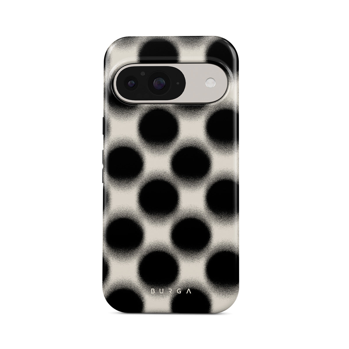 Este design contém: bolinhas pretas, padrão minimalista, padrão geométrico, desfocado