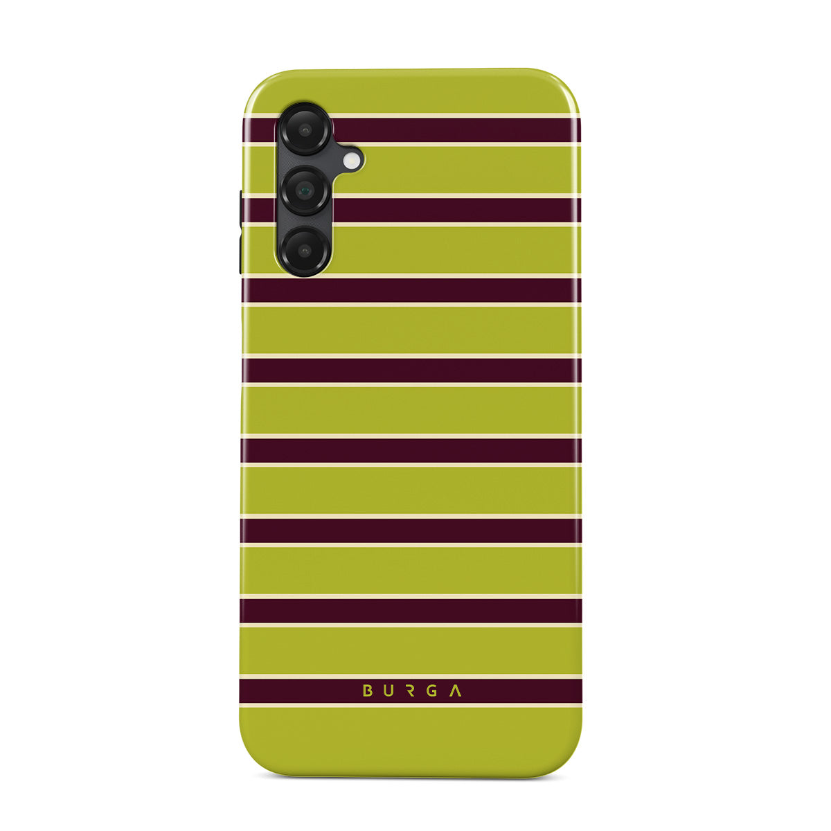 Este design contém: listras horizontais grossas em verde-limão e bordô.