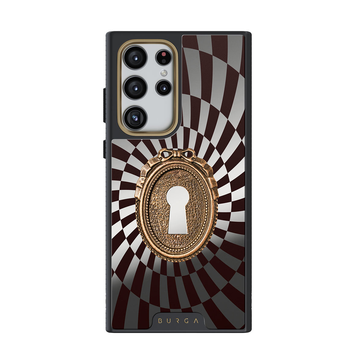 Este design contém: ilusão ótica, fechadura, moldura vintage, espelho