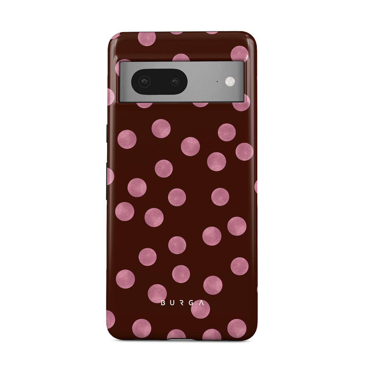 Este design contém: bolinhas cor-de-rosa, fundo castanho, padrão pontilhado