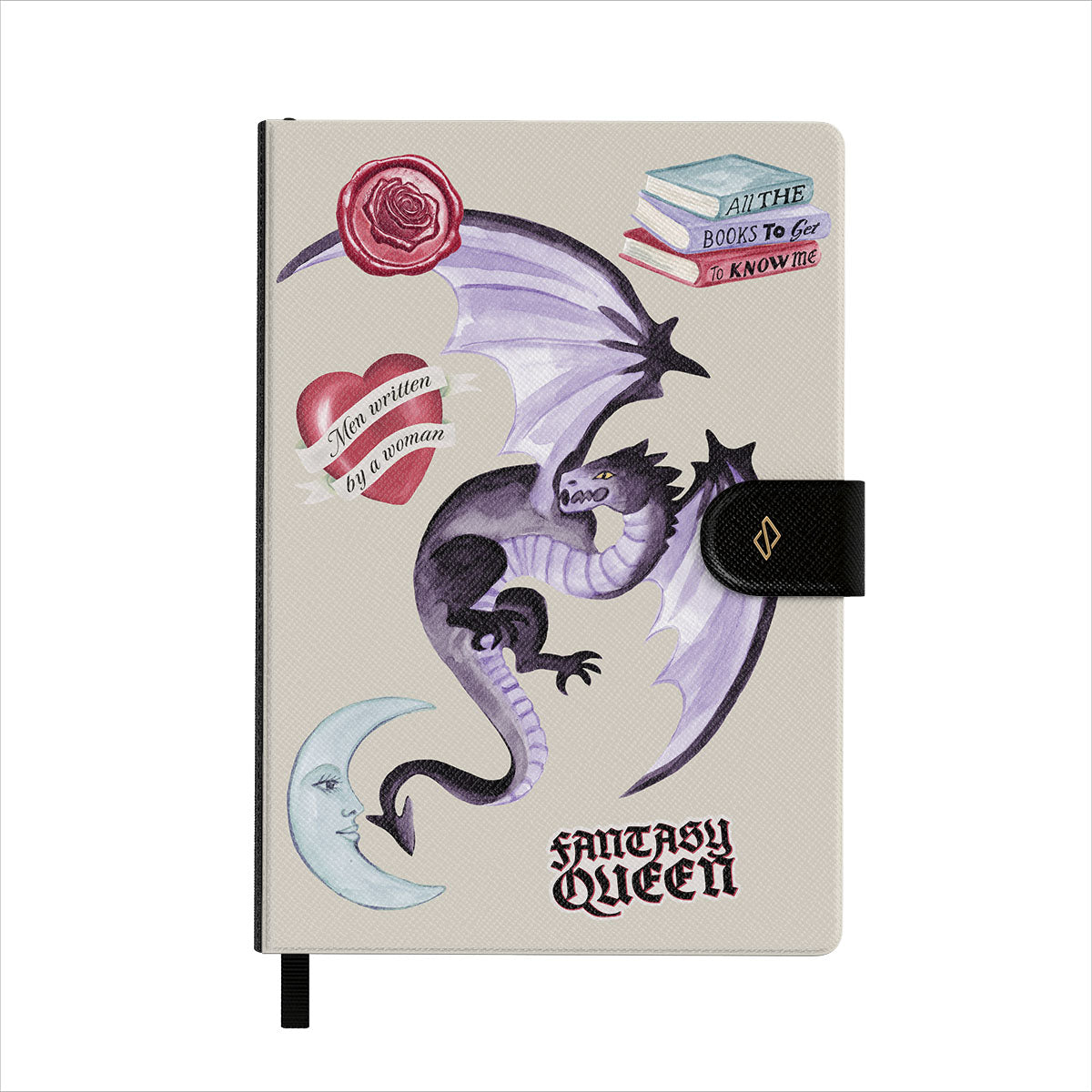 Este design contém: dragão roxo, adesivo "Rainha da Fantasia", lua crescente, lacre de cera roxa, coração com mensagem, livros.