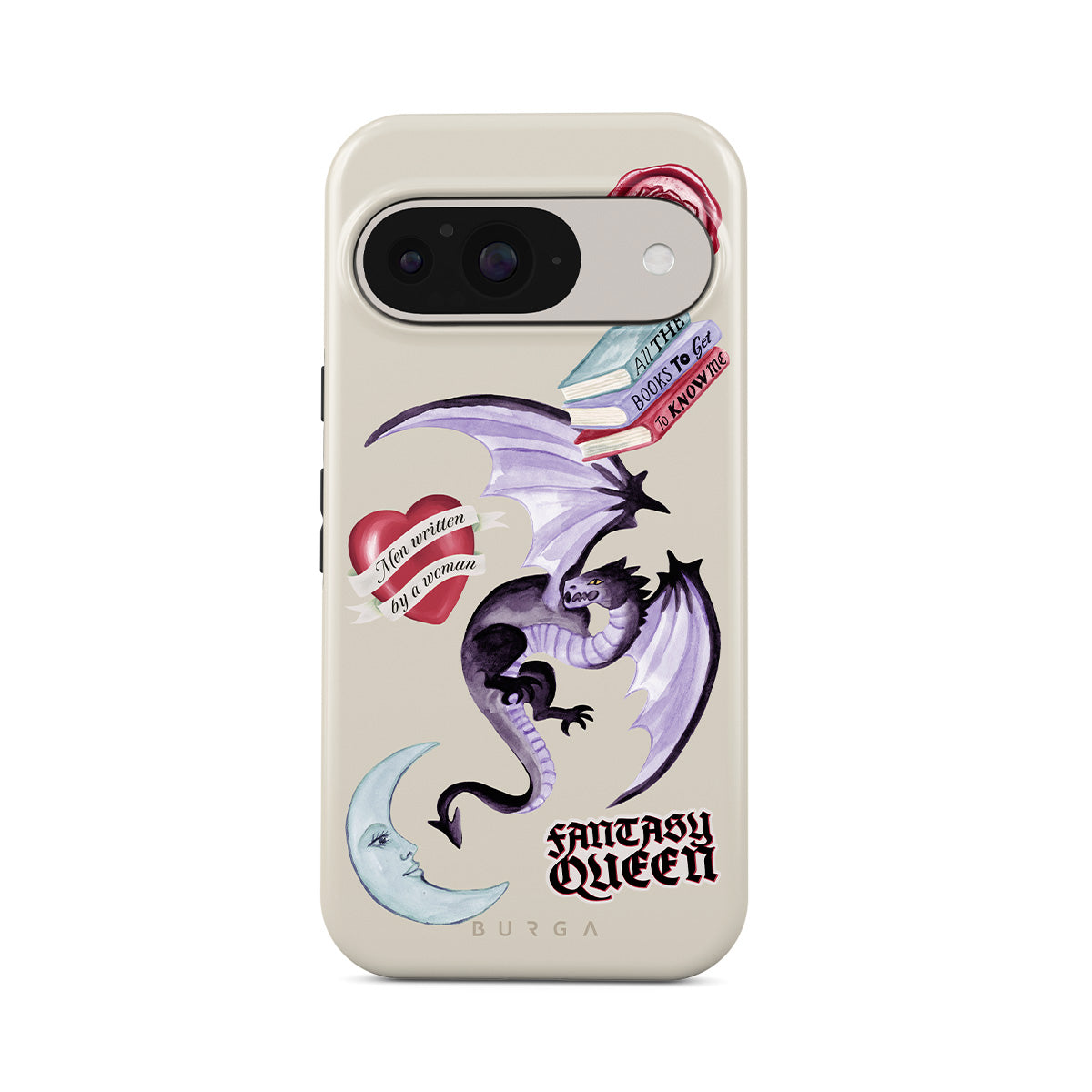Este design contém: dragão roxo, adesivo "Rainha da Fantasia", lua crescente, lacre de cera roxa, coração com mensagem, livros.