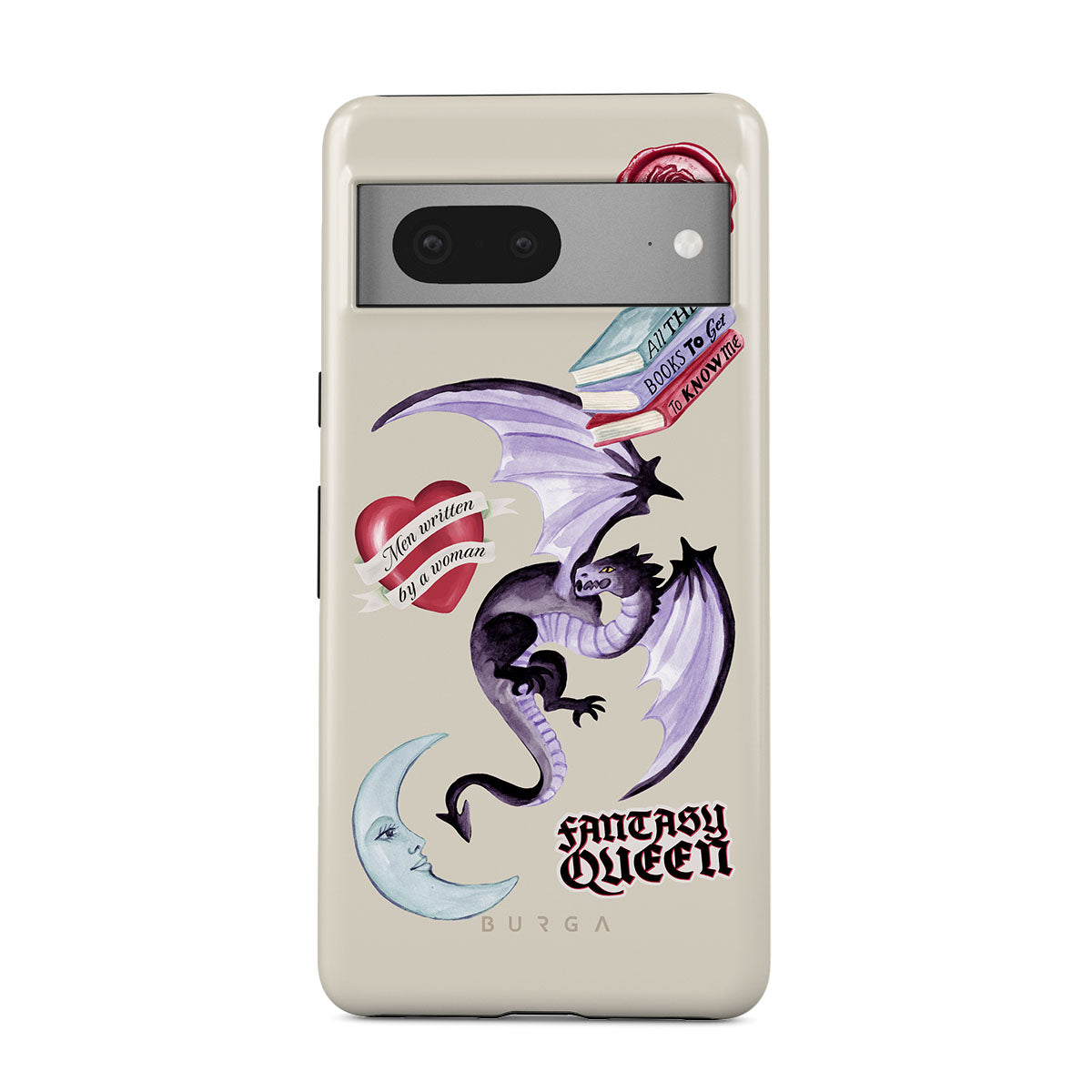 Este design contém: dragão roxo, adesivo "Rainha da Fantasia", lua crescente, lacre de cera roxa, coração com mensagem, livros.