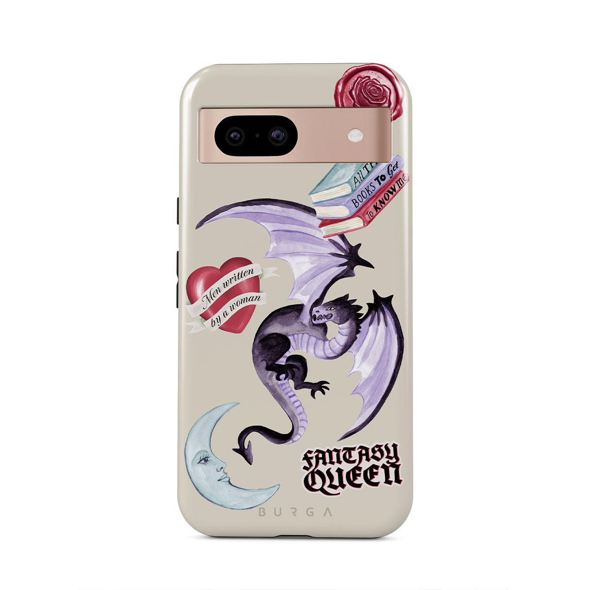 Este design contém: dragão roxo, adesivo "Rainha da Fantasia", lua crescente, lacre de cera roxa, coração com mensagem, livros.